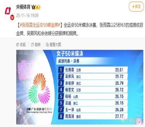 据央视体育微博消息,全运会50米蝶泳决赛,张雨霏以25秒61的成绩收获金牌,吴卿风和余依婷分获银牌和铜牌。