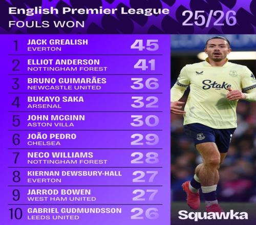 当地时间12月18日,知名数据机构Squawka发布了2025/26赛季英超联赛被犯规次数榜(截至第16轮),埃弗顿球员格拉利什被犯规45次位居榜首。