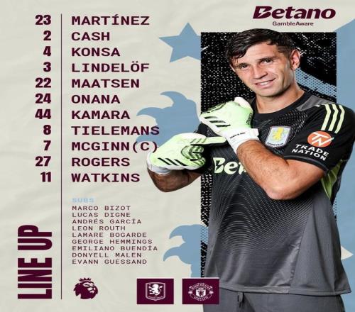 阿斯顿维拉首发:23-达米安-马丁内斯、2-卡什、4-孔萨、3-林德洛夫、22-马特森、24-阿马杜-奥纳纳、44-布巴卡尔-卡马拉、8-蒂勒曼斯、7-麦金、27-摩根-罗杰斯、11-沃特金斯