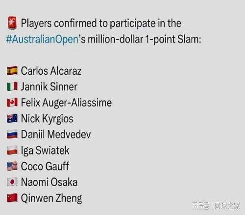 北京时间今晨,2026澳网官方宣布,中国球员郑钦文确认出战新推出的“一球制胜”大满贯。此次与小郑同学一起确认参赛的球员还有俄罗斯名将梅德维德夫、日本名将大坂直美和加拿大名将阿利亚西姆。至此,已经确认参赛的职业球员达到9人,包括阿尔卡拉斯、辛纳、克耶高斯、斯瓦泰克、高芙,尚剩余13个席位待定。