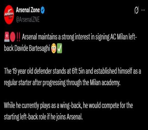 据意大利《米兰体育报》报道,阿森纳在一月转会窗开启前已对AC米兰后卫巴尔泰萨吉产生了浓厚兴趣。枪手希望这个冬天把这位边后卫带到英格兰。对枪手而言,这是一笔面向未来的精明投资,可在未来数年逐步培养。巴尔泰萨吉主打左后卫,喜欢上下翻飞,必要时参与进攻,将与卡拉菲奥里、刘易斯-斯凯利等人竞争主力位置。