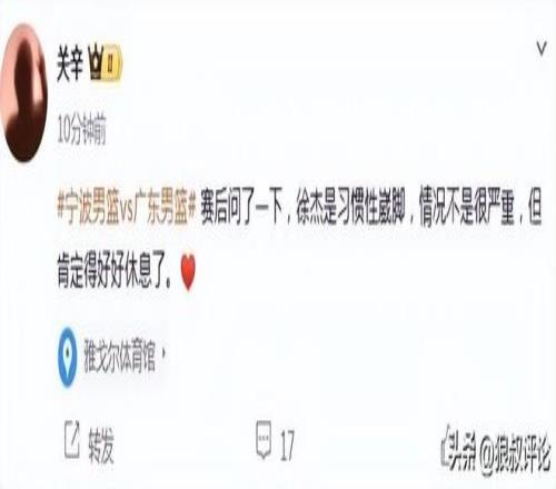 当时广东体育记者关辛发文报道,徐杰是习惯性崴脚,情况不是很严重,但肯定得好好休息了。