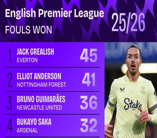 当地时间12月18日,知名数据机构Squawka发布了2025/26赛季英超联赛被犯规次数榜(截至第16轮),埃弗顿球员格拉利什被犯规45次位居榜首。本赛季英超被犯规榜(截至第16轮)1、格拉利什(