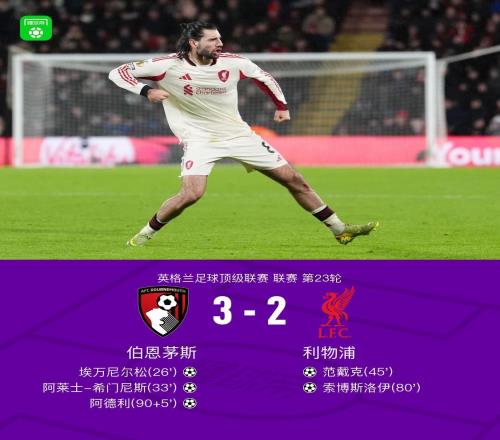 独家看英超就在咪咕第33分钟,希尔送出直塞,希门尼斯推射穿裆入网!伯恩茅斯2-0利物浦独家看英超就在咪咕第45分钟,将功补过!索博斯洛伊助攻范戴克头球后蹭得手,利物浦1-2独家看英超