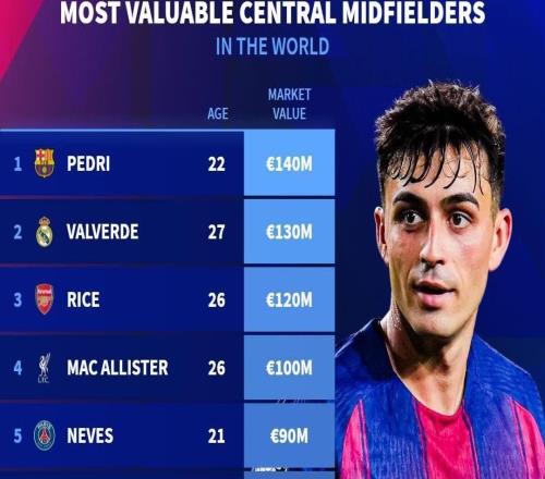 在完成最新一次身价更新后,德国转会市场网站列出了世界足坛中前卫身价榜,佩德里以1.4亿欧居首,巴尔韦德以1.3亿